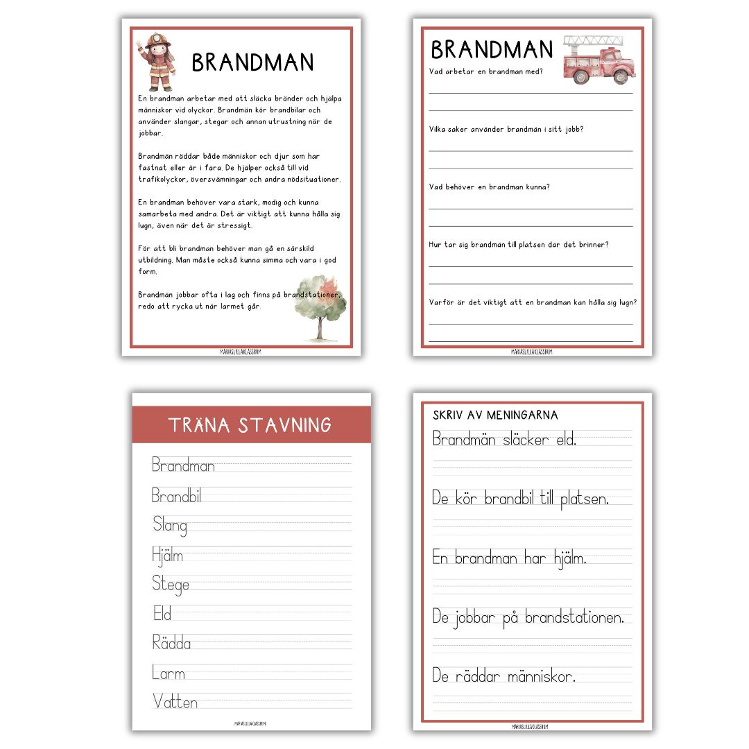 I det här arbetshäftet lär vi oss mer om yrket brandman.